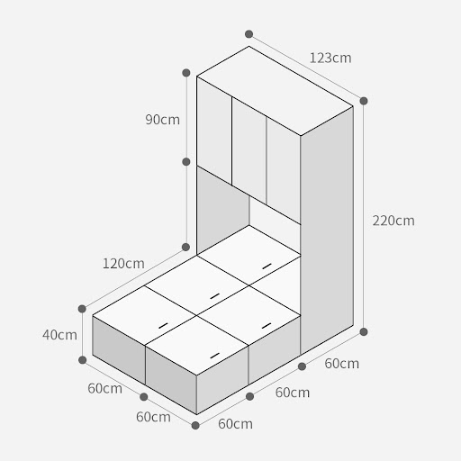 材料:E1纖維板MDF 產地:中國 由六個地台組合而成,外面一排兩個可選櫃桶 床頭連高身衣櫃,慳位穩陣 非遠區有lift直上包送貨及安裝,樓梯及推路另議 大約7-10日夾時間送貨 支持落訂送貨,交貨收尾數